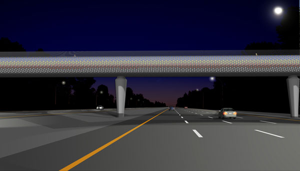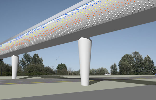 A selected artists’ call entry for a proposed pedestrian overpass spanning Highway 1 at Tynehead in Surrey. The prominent location of the overpass required that the artist and engineering design team would work collaboratively to produce a showpiece structure. The artwork was required to be memorable, site specific, zero maintenance, and low cost.